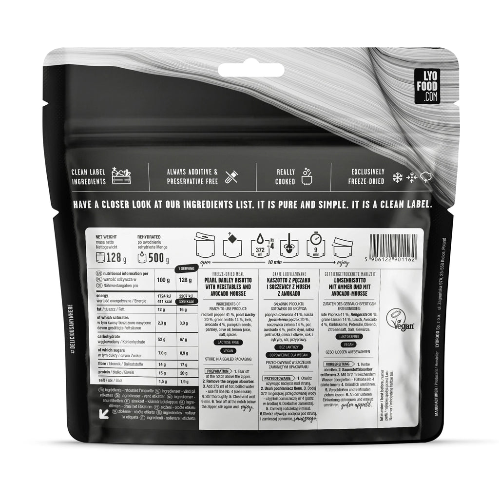 LYO Food’s Barley-Lentil Risotto is a modern vegan twist on the classic North Italian dish, perfect for outdoor adventure enthusiasts. This freeze-dried risotto blends pearl barley and green lentils with red bell pepper, leek, pumpkin seeds, and a creamy avocado mousse, creating a hearty and flavorful meal. Whether on the trail or enjoying a cozy meal by the fire, this risotto provides a nourishing and delicious option for a warm, satisfying meal.