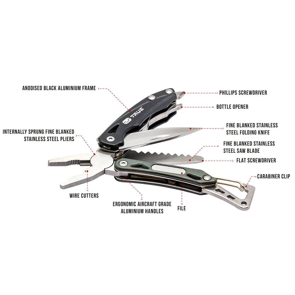 True Utility Seven is a must-have multitool, equipped with 9 handy functions to help you tackle the day. Made from high grade fine blanked stainless steel and anodised aircraft grade aluminium handle, this reliable multitool is durable and easy to use. Equipped with a quick release carabiner clip, Seven can attach to your keyring, bag or person for ease of access. Perfect for everyday tasks such as tightening screws or opening boxes.