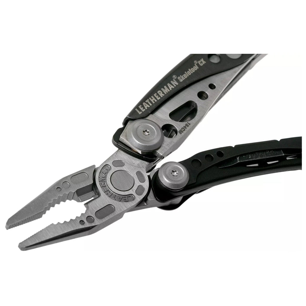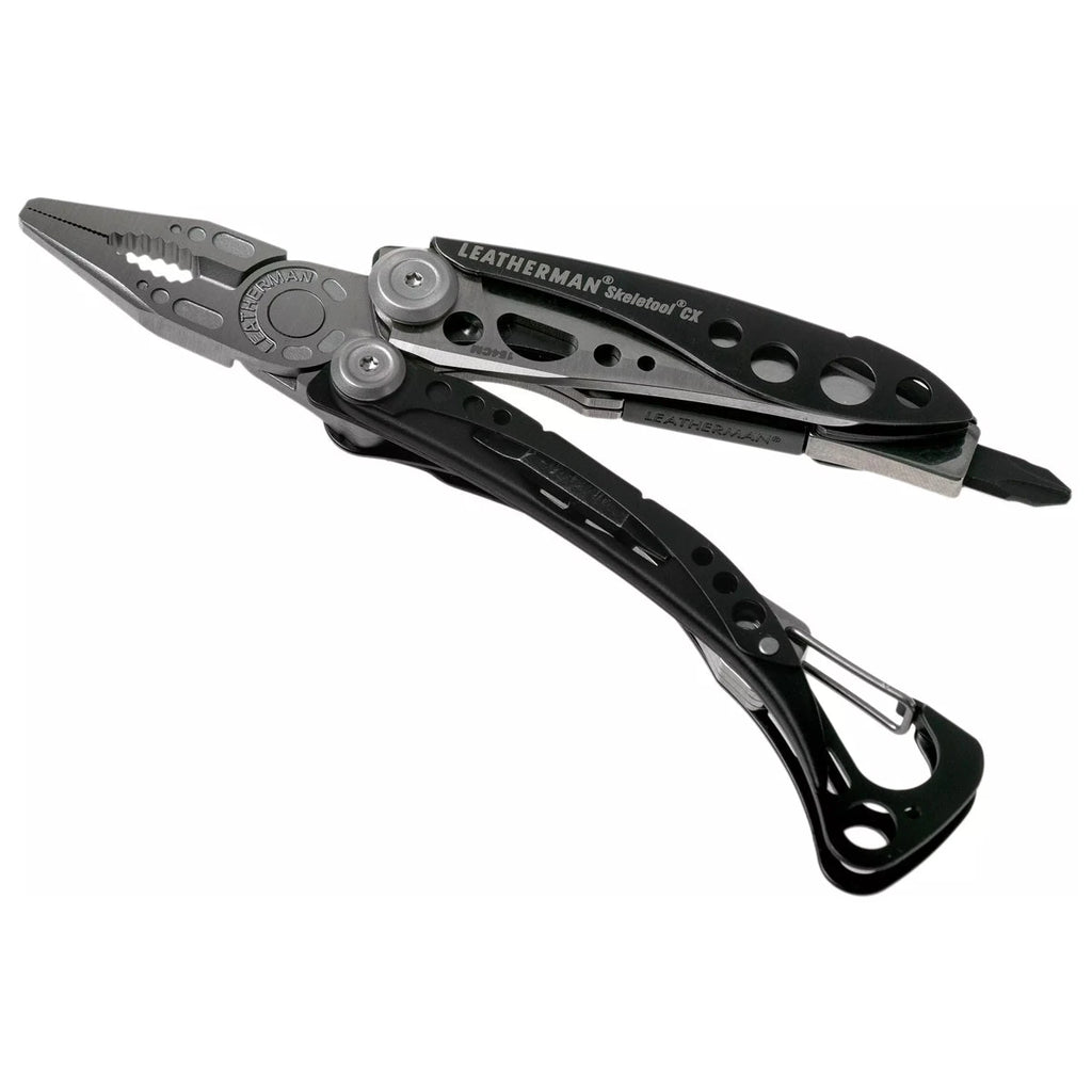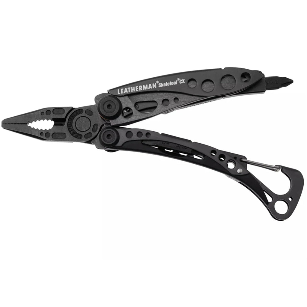 The CX Black/Stainless Skeletool is a precisely crafted multitool, perfect for those who prioritize both convenience and versatility. Boasting seven high-performance tools, including a 154CM stainless steel knife blade, pliers, and a bit driver, this lightweight and ergonomic tool is designed for everyday use, outdoor adventures, and any toolkit. Weighing in at only 142 grams, it's ultra-portable and ready for any task. The open-frame design not only reduces weight but also improves grip and handling. Built with high-quality stainless steel, this multitool is both durable and resistant to corrosion, making it suitable for any environment. The versatile bit driver allows for a wide range of screwdriving tasks, and the carabiner doubles as a bottle opener, adding a touch of practicality to this sleek and streamlined tool. Meet your efficiency and design needs with the Leatherman CX Black DLC Skeletool Stainless.