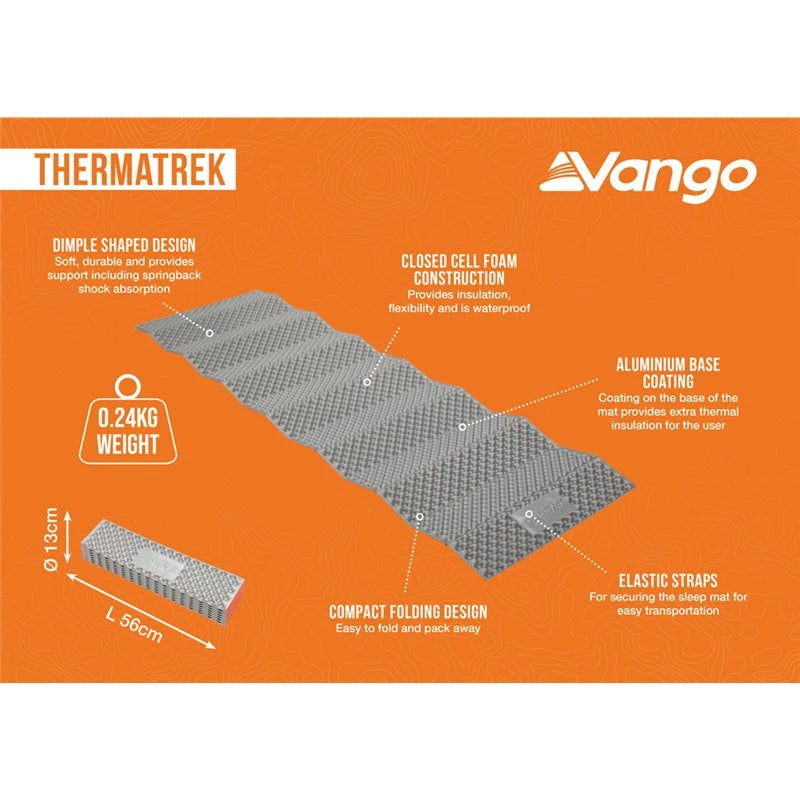 The Vango ThermaTrek sleep mat ensures a warm and comfortable sleep, perfect for your adventures. Its Closed Cell construction retains heat and is waterproof, with an aluminium base for added insulation.