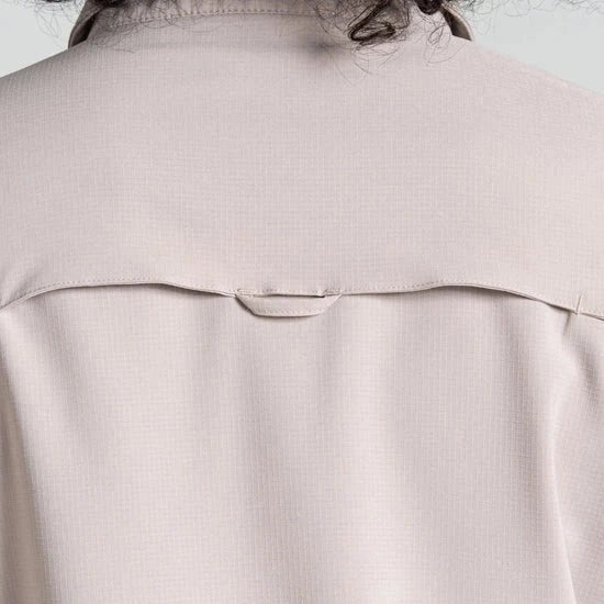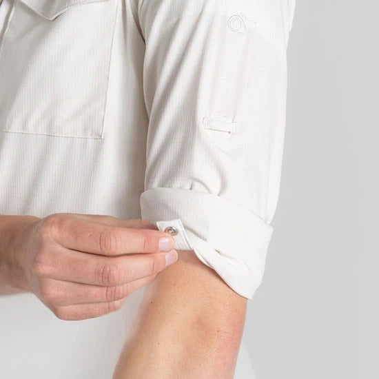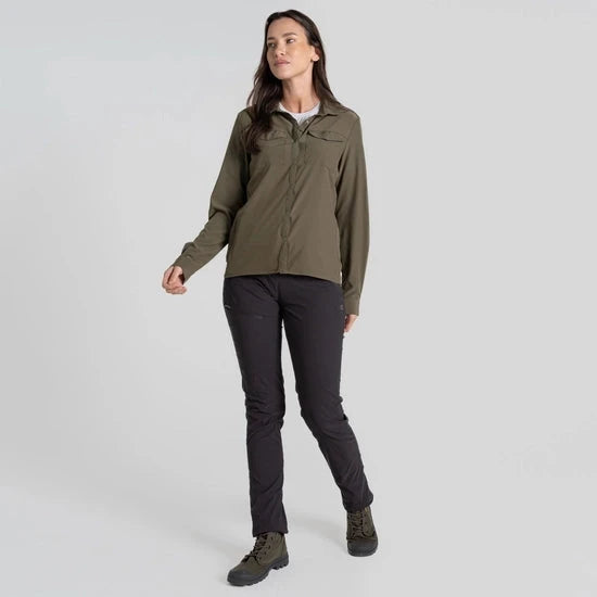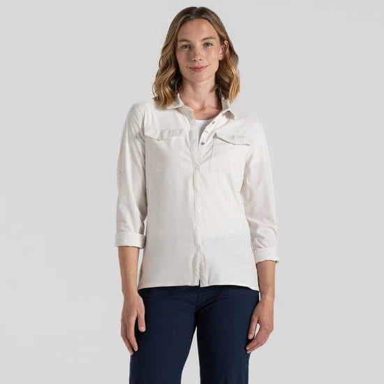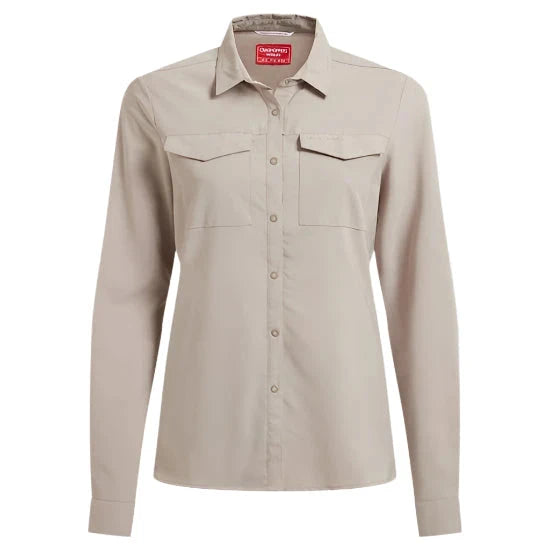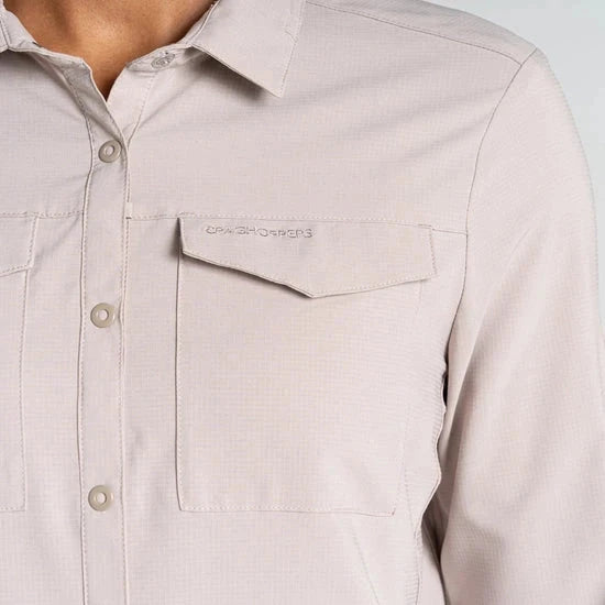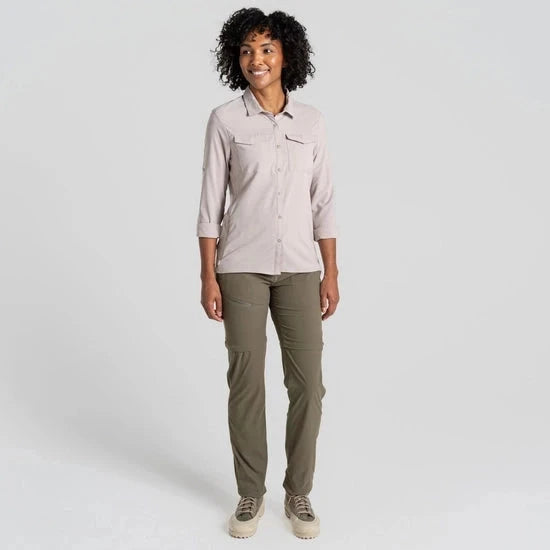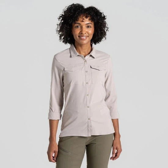 The Craghoppers Women's NosiLife Pro Long Sleeved Shirt III is the ultimate adventure shirt, blending pared-back styling with high-performance features. Built with NosiLife insect-repellent and odour-elimination fabric, this lightweight, stretch shirt offers agile movement and quick-drying comfort in challenging conditions. Sun-protective and moisture-controlling, it ensures you stay cool, fresh, and protected throughout the day.