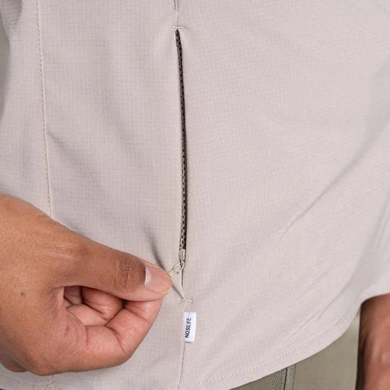 Main Fabric: NosiLife lightweight stretch part recycled polyester elastane ripstop shirting with polyester mesh trim and recycled zip tape