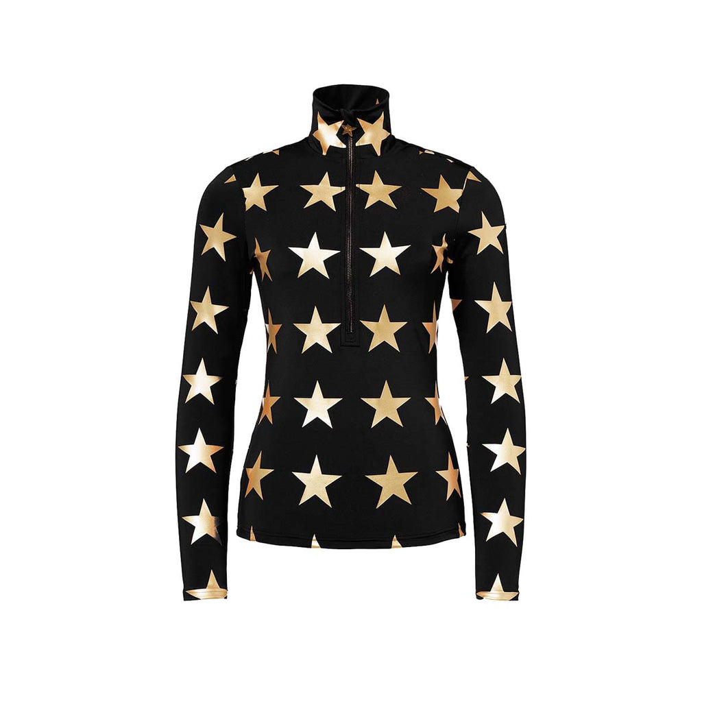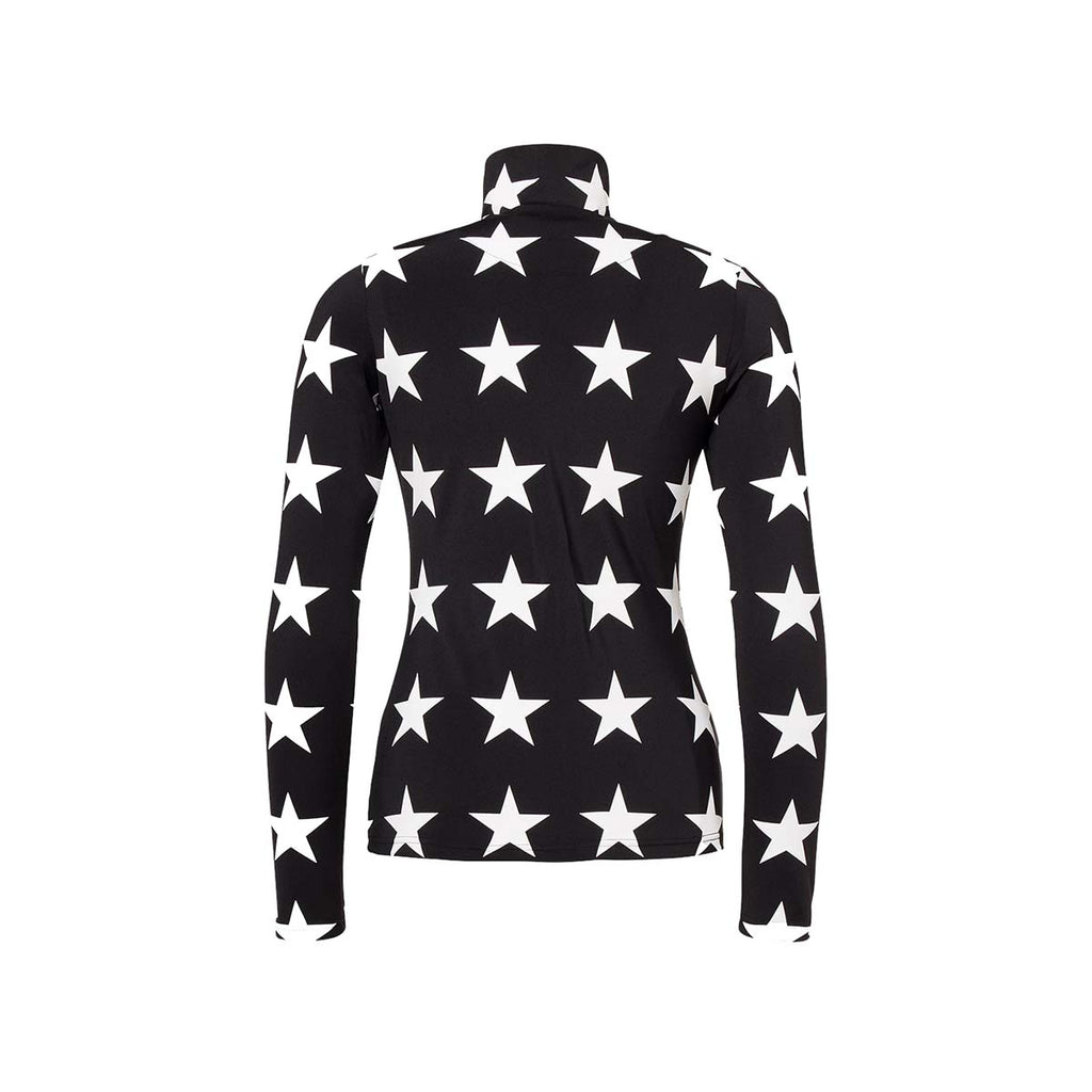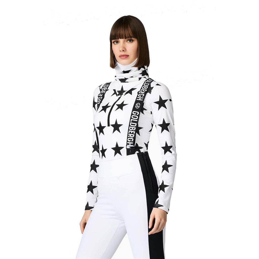 The Goldbergh LUNARIA Ski Pully features an all-over star print on powerstretch fabric with a soft brushed back, offering warmth, flexibility, and standout slope style.