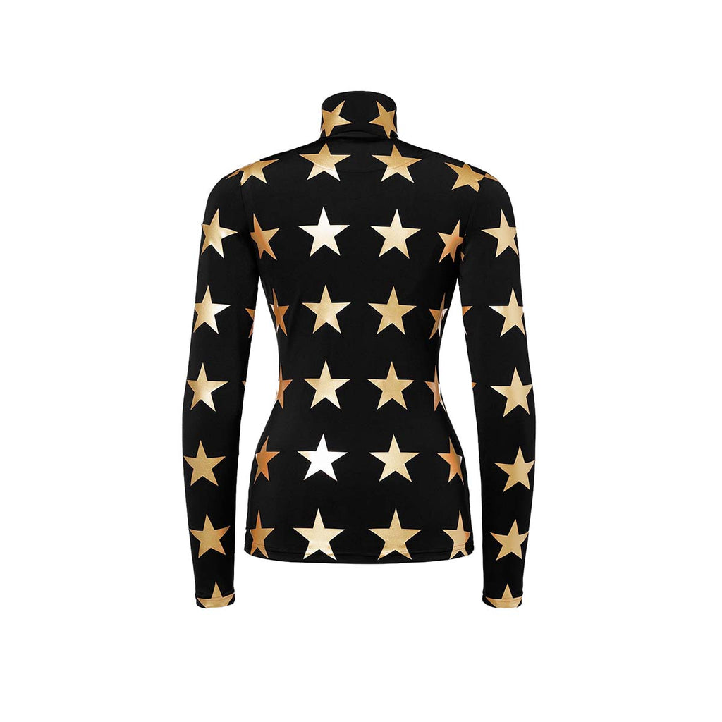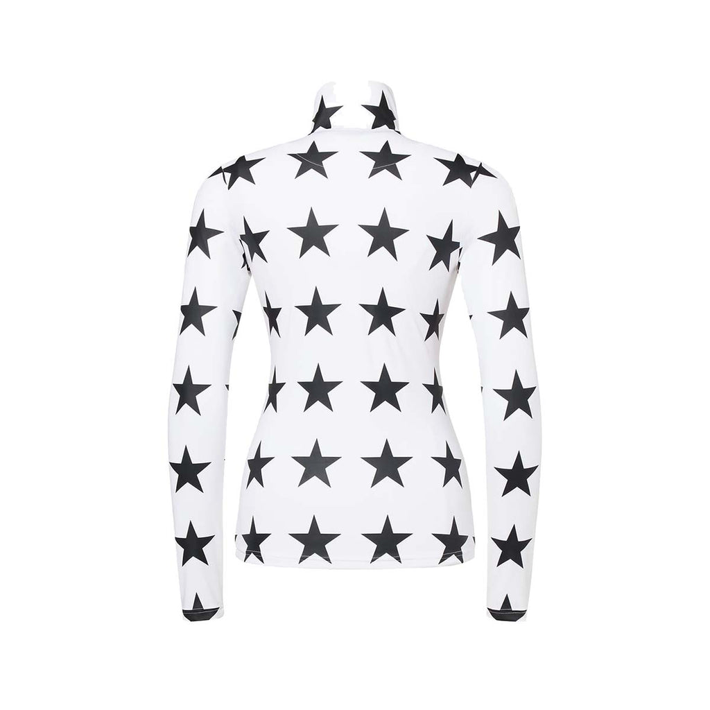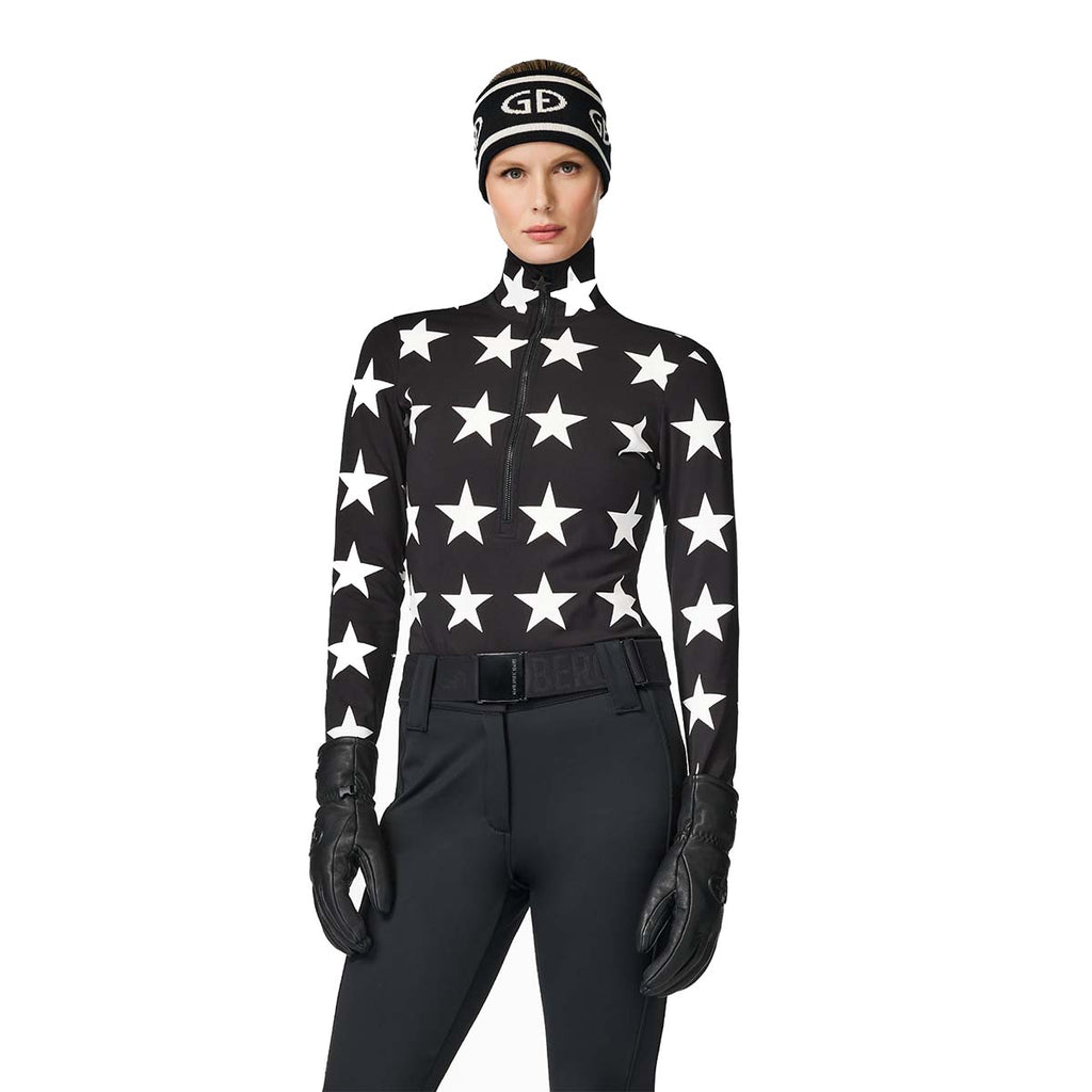 The Goldbergh LUNARIA Ski Pully features an all-over star print on powerstretch fabric with a soft brushed back, offering warmth, flexibility, and standout slope style.