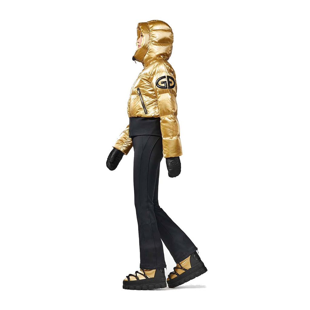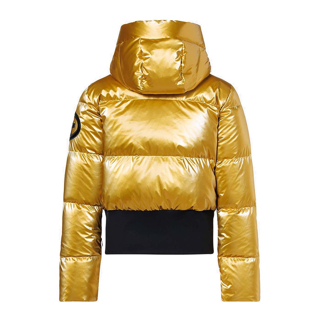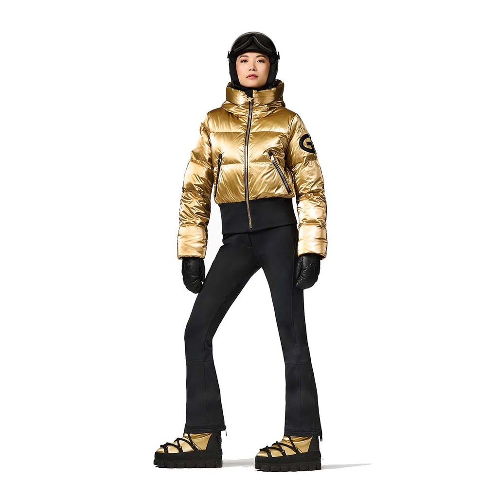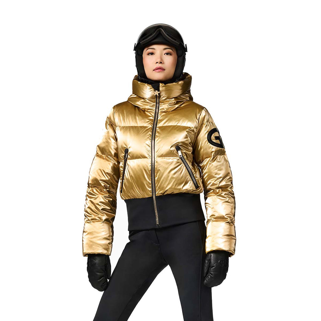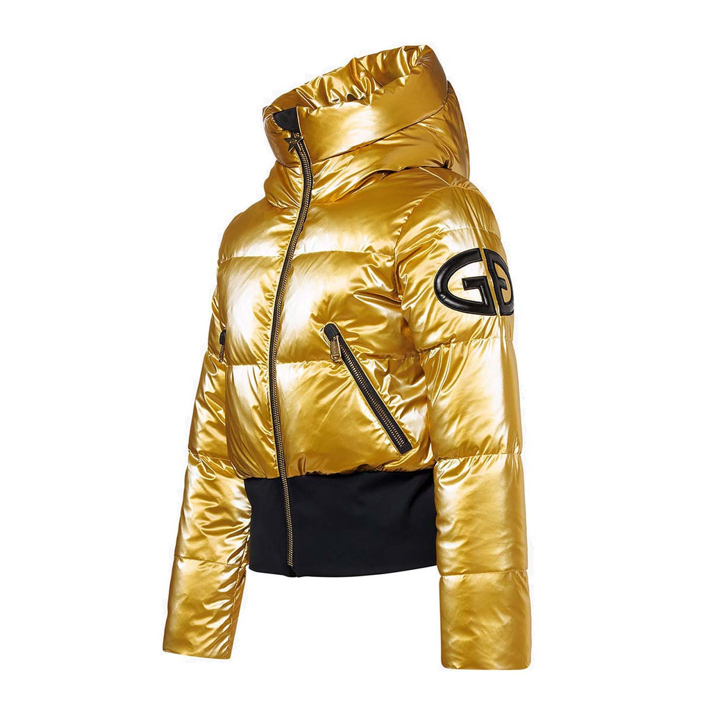 The Goldbergh BOMBARDINO Ski Jacket is a sleek down bomber with a fixed hood, crafted for warmth, performance, and standout slope style with sustainable touches.