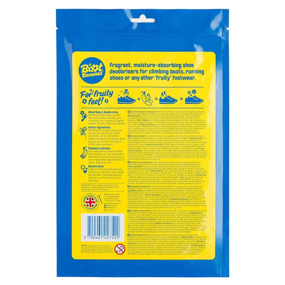 Discover the natural freshness of Boot Bananas Original Shoe Deodorisers, brought to you by Great Outdoors, Ireland's oldest outdoor retailer. Perfectly crafted to tackle the most stubborn odours, these eco-friendly deodorisers are a blend of odour-neutralising salts, minerals, and exquisite botanicals, featuring fragrances of Lavender, Lemon, Patchouli, and Tea-tree. Designed specifically for sports shoes and boots, they effectively remove and prevent ingrained smells, ensuring your footwear stays fresh.