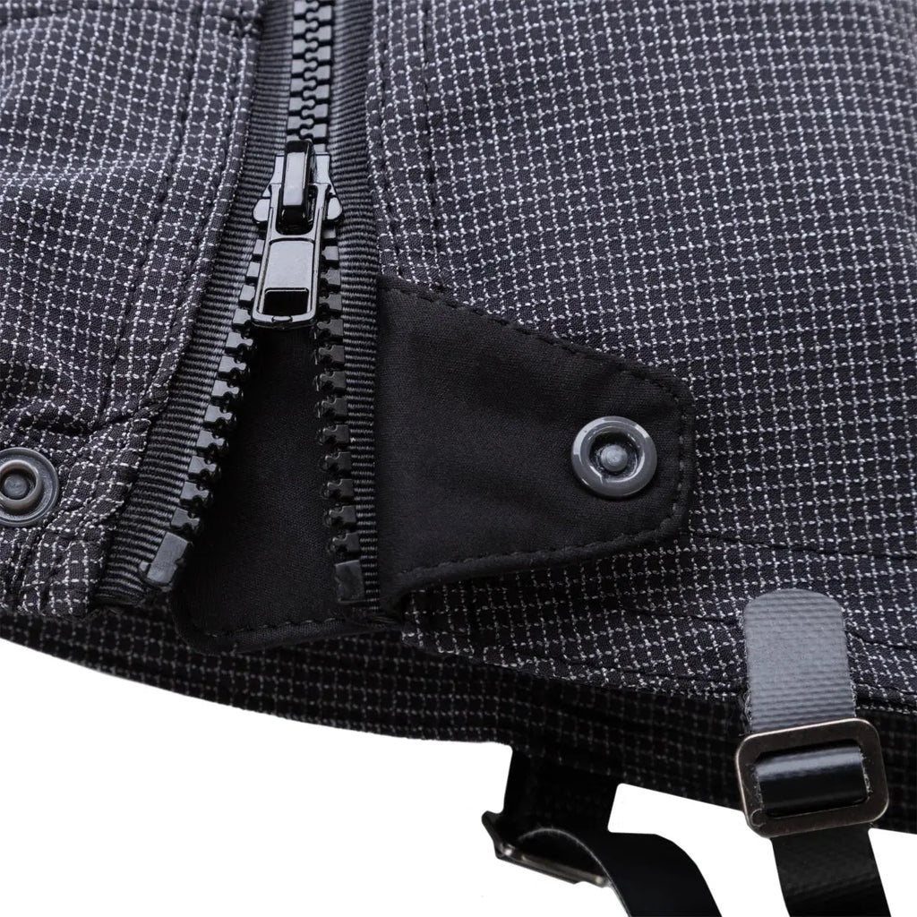 - Zipped side closure with press stud tab at base