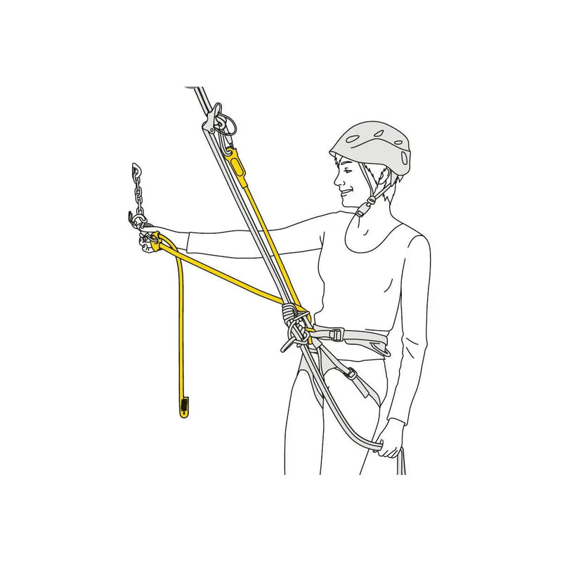 • Adjustable double lanyard for tethering to an anchor and installing a rappel system