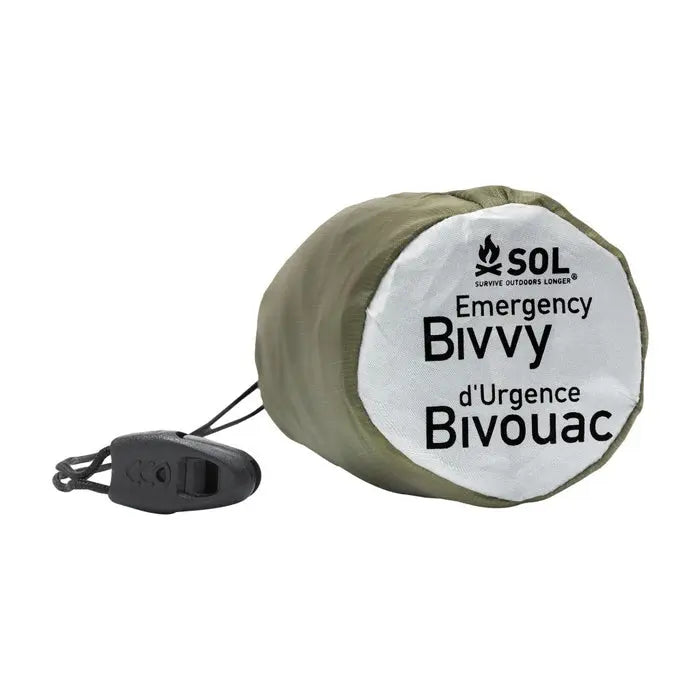 The Emergency Bivvy with Rescue Whistle in OD Green is your go-to solution for staying warm and dry in emergency situations. Weighing under 4 oz. and compact enough to fit in your pocket, this bivvy reflects 90% of body heat and is designed to protect against wind, rain, and snow. It also comes equipped with a rescue whistle and a tinder cord drawstring for fire starting, making it an essential survival tool.