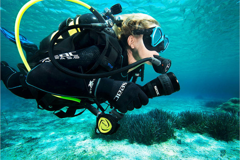 A great choice for free diving, the Seac Flash snorkel features an anti-splash top that effectively blocks water from entering the snorkel. It also includes an innovative purge valve system that sits below the mouthpiece for rapid emptying of water. The tube is constructed of durable PVC with bellows in liquid silicone, and its corrugated flexible hose allows you to manage the angle of the nozzle. It's complemented by a silicone mouthpiece that features a comfortable ergonomic fit with plenty of bite for teeth to keep your jaw relaxed.