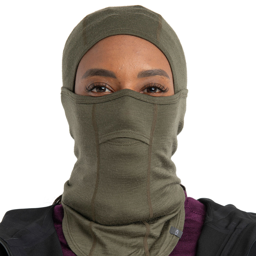 A lightweight unisex merino balaclava with breathable warmth and a ventilation flap for cold-weather versatility.