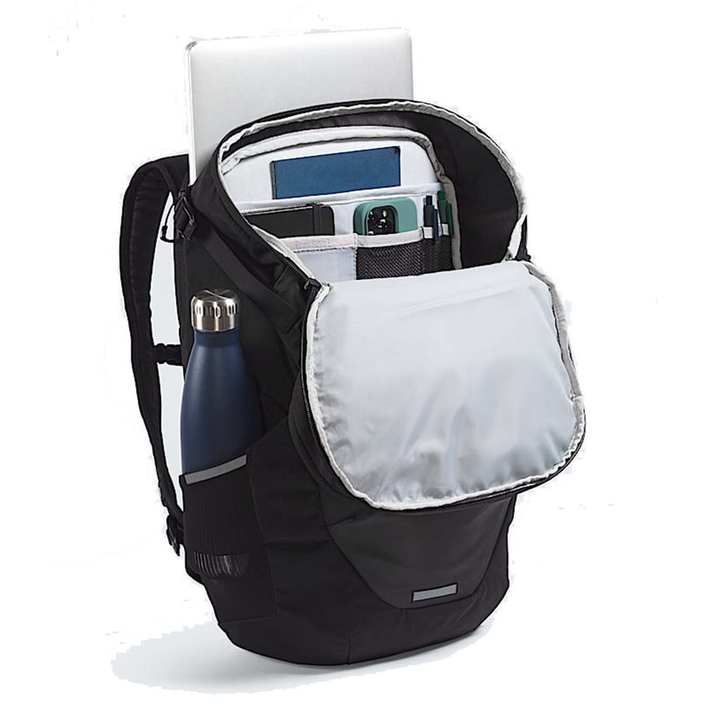 Secure-zip top-lid pocket with sleeve pocket, pen slots, and fleece-lined storage for phone or sunglasses