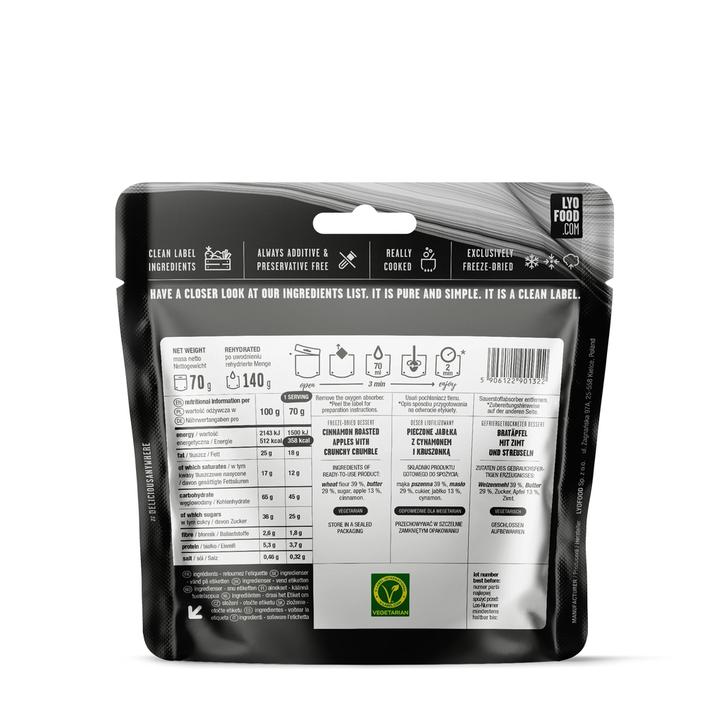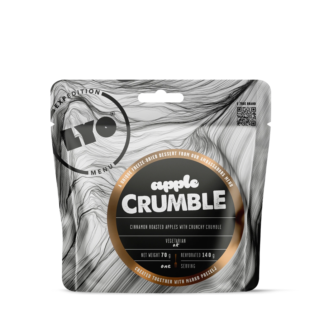 LYO Food's Apple Crumble Freeze-Dried Dessert is a sweet treat ready for any adventure. Created with legendary climber Marko Prezelj, this dessert brings the comforting taste of home to the most remote locations. Roasted apples, a hint of cinnamon, and crunchy crumble make this freeze-dried meal irresistible, whether you're high in the mountains or deep in the wilderness. Pro tip: Use less water for a crispier texture!