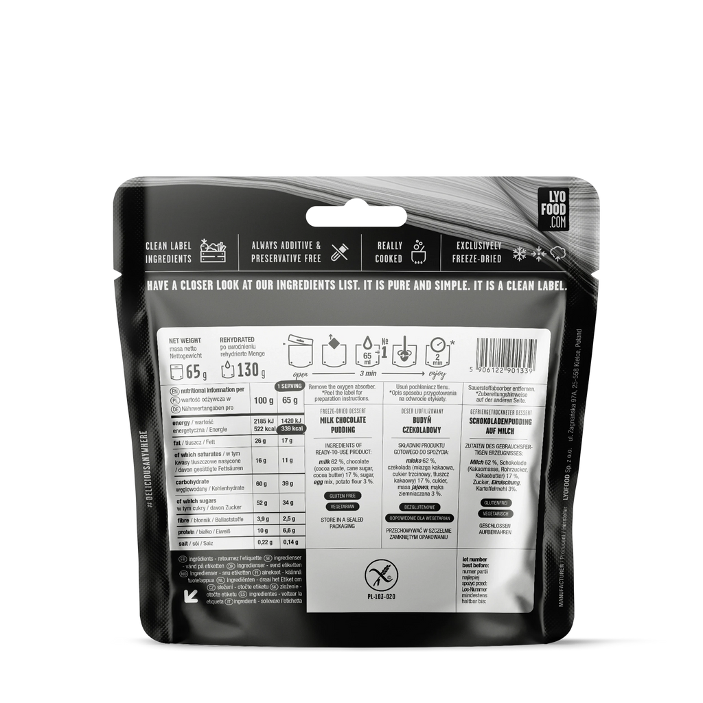 LYO Food’s Chocolate Pudding is a decadent, freeze-dried dessert that brings the perfect reward for any adventure. Creamier than ever and packed with rich chocolate flavor, this pudding is the ideal treat after a long day on the trail. Add a handful of freeze-dried Wild Berry Mix or Sour Cherry to elevate your outdoor dessert experience. Whether you’re camping, hiking, or backpacking, this indulgent dessert is quick and easy to prepare.