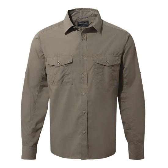 The Craghoppers Kiwi Long Sleeved Shirt is your reliable companion for outdoor adventures. Constructed from tough, part-recycled polyester-cotton fabric, this relaxed shirt is designed to handle challenging conditions. With NosiDefence insect barrier, UPF 50+ sun protection, and practical features like a flip-up collar and drying loops, it ensures comfort and durability year-round.