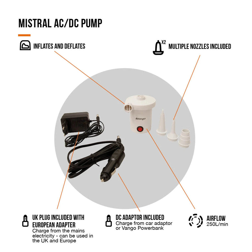 The powerful 250L/min airflow of the Vango Mistral AC/DC Pump makes it simple to inflate and deflate your air mattress or inflatable camp furniture. Wherever you travel, setting up camp is easy thanks to the electric camping pump's many nozzle options and ability to be powered by a UK/EU plug, DC car socket, or power bank.