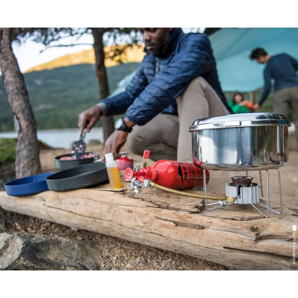 Tough and stable, it also excels in institutional and guides service settings, easily handling pots up to 10” in diameter. Its dual-valve design delivers the flame control you need for simmering sauces and goes from zero to searing at the twist of a knob for melting snow and brewing up fast.