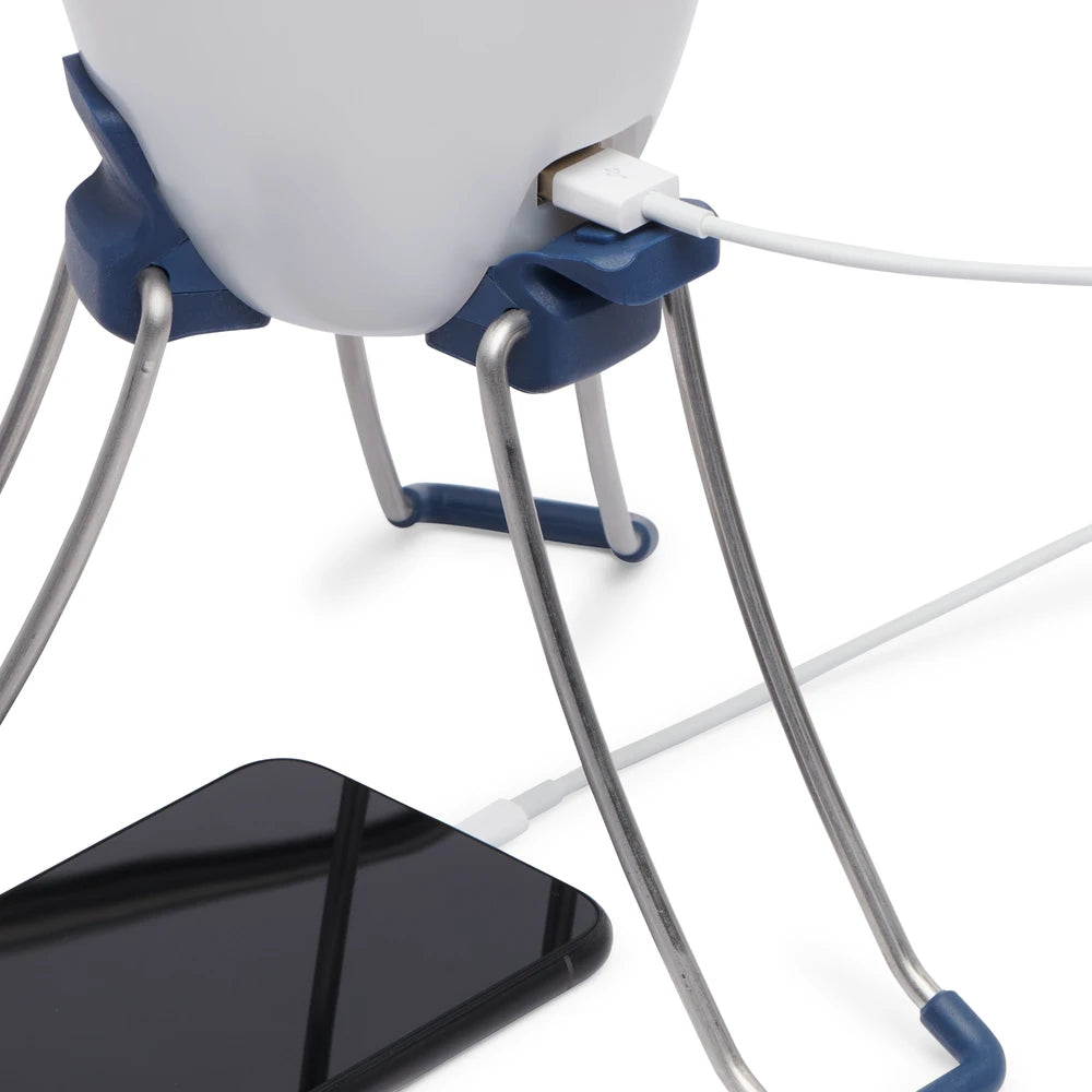- Tabletop lighting with folding legs and double-hook hang loop