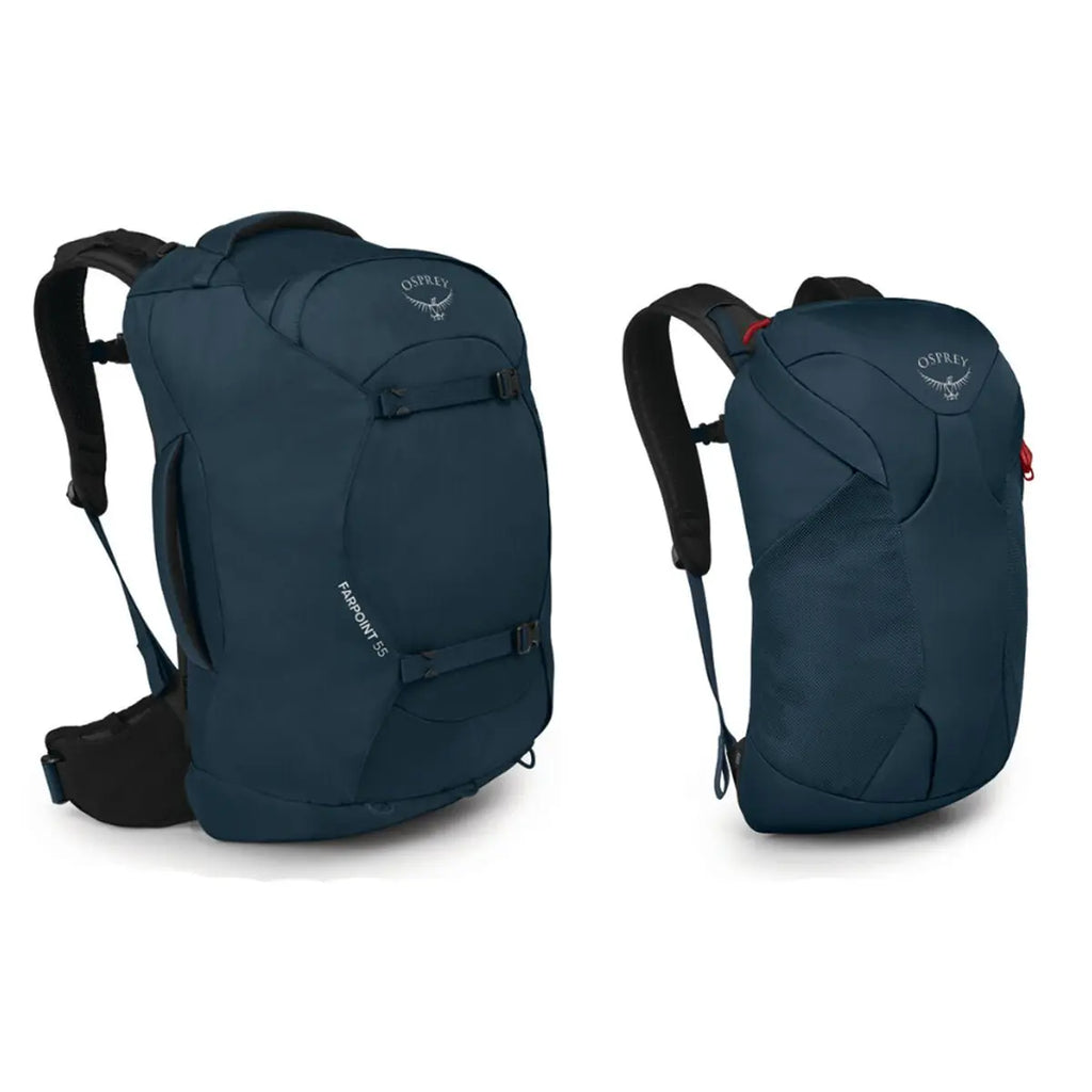 The Osprey Farpoint® 55 offers a 40L main pack with a 15L detachable daypack, ideal for versatile and lightweight travel.