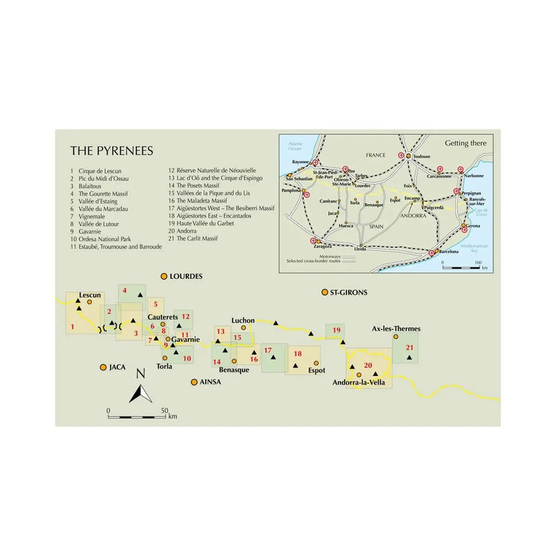 The book is organized into 21 sections based on valleys and massifs, including popular highlights such as Monte Perdido, Pic du Midi d'Ossau, and Ordesa National Park. Each route is detailed with sketches, maps, transport information, and insights on local amenities, making it an invaluable resource for hikers and climbers.