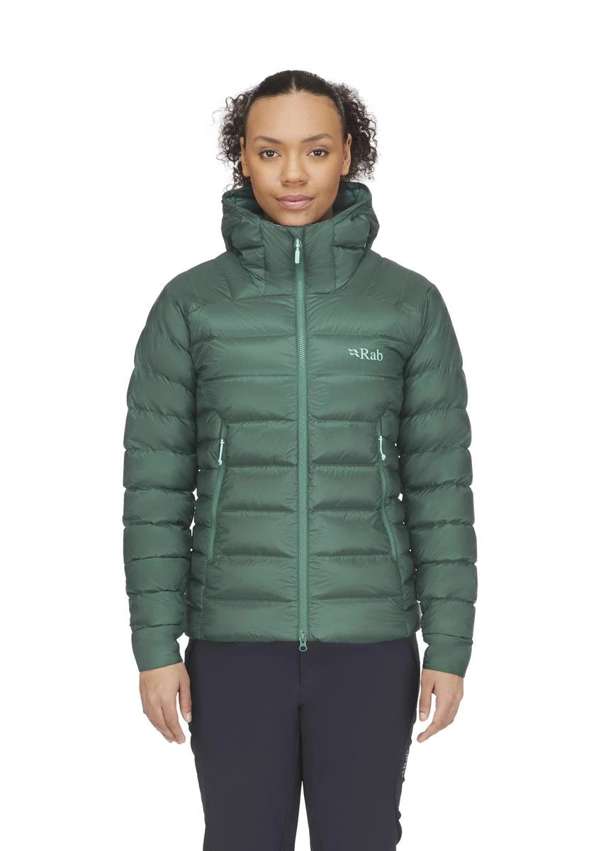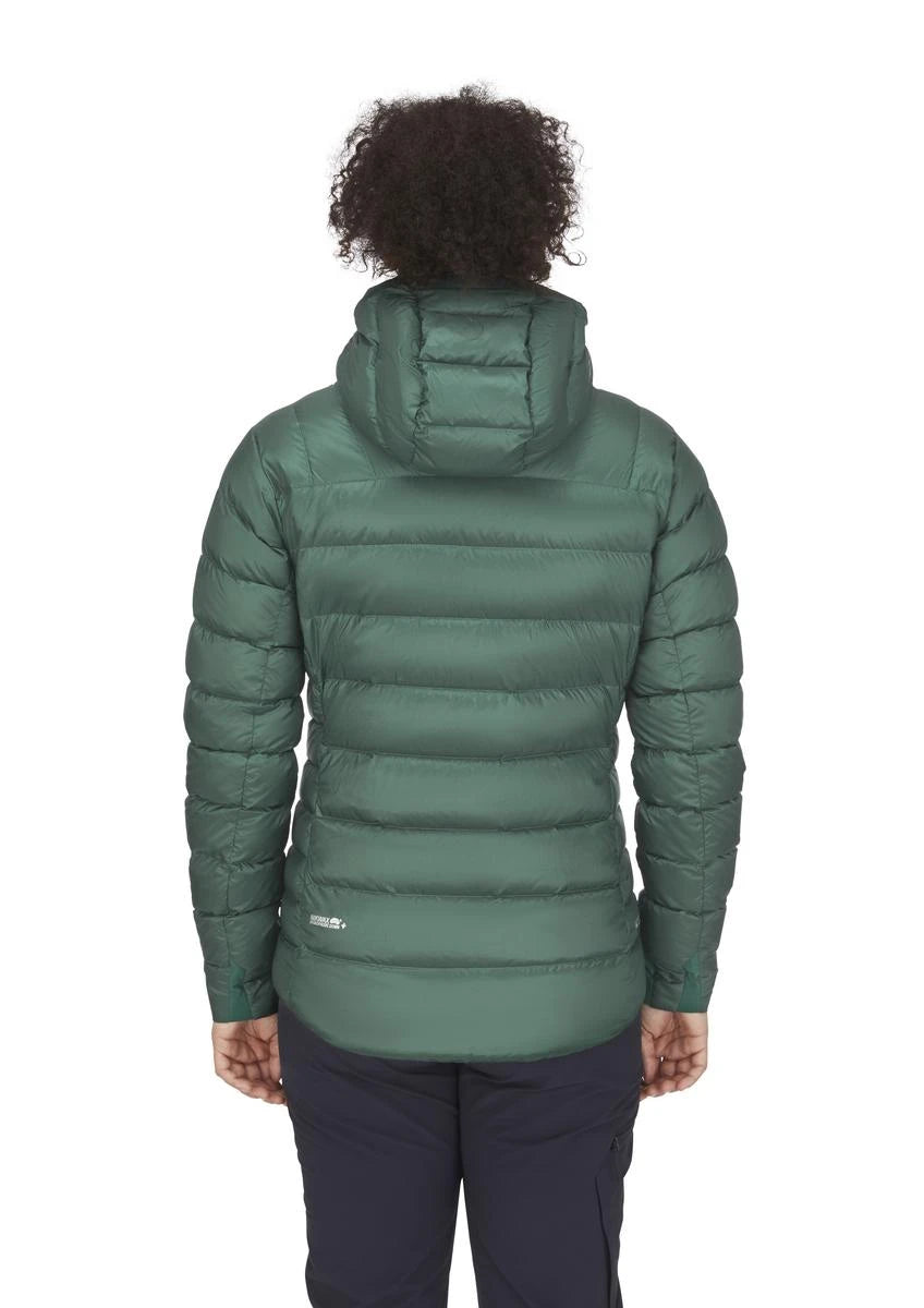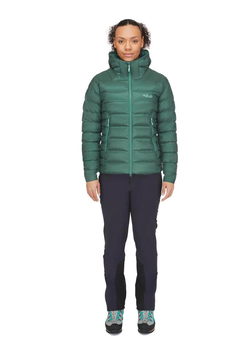 The Women's Electron Pro Down Jacket by Rab offers exceptional warmth with its high-loft, hydrophobic down, ideal for cold-weather mountaineering. Lightweight, durable, and highly breathable.