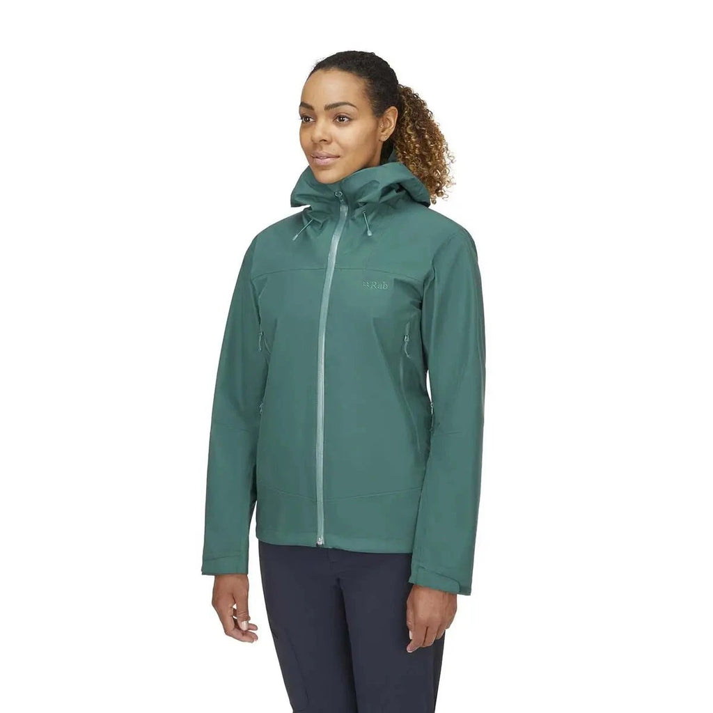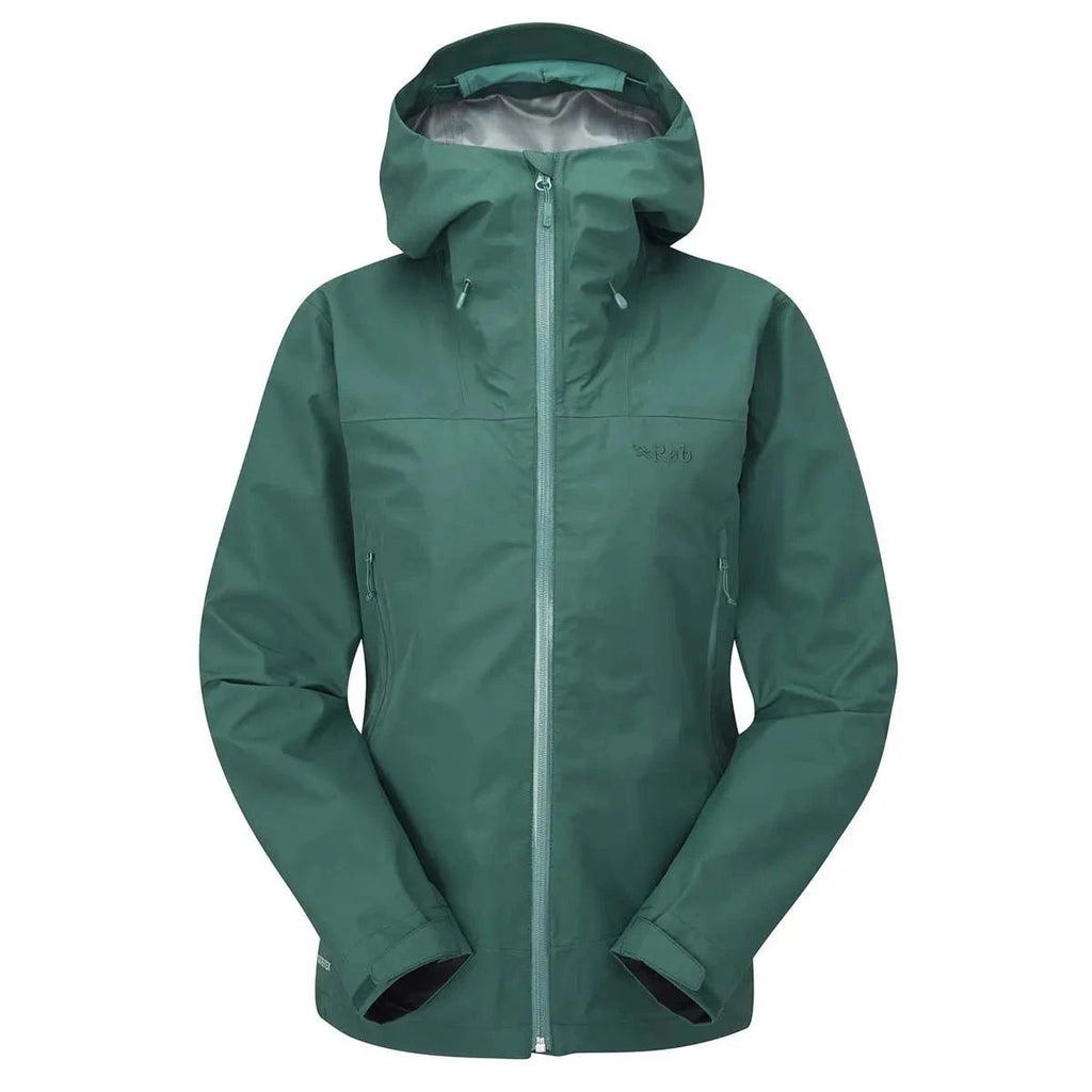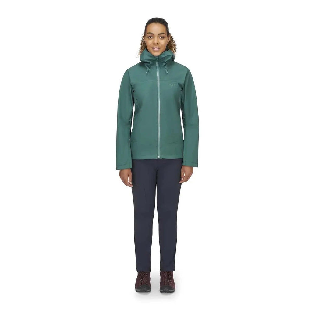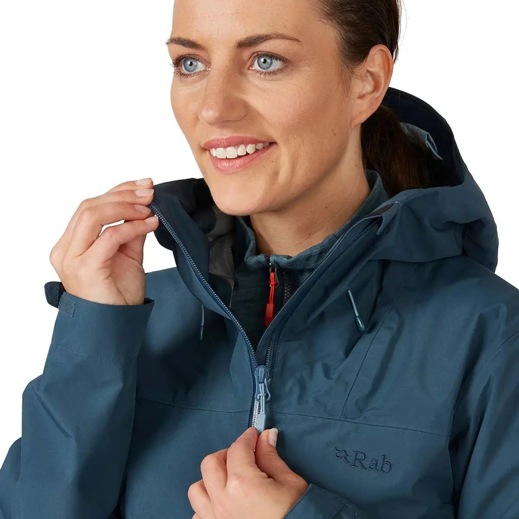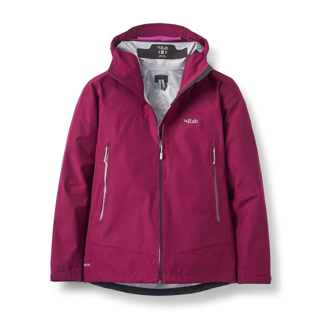 The Rab Women's Namche Jacket is a lightweight, packable shell built with 3-layer GORE-TEX for waterproof, windproof protection. Ideal for hiking and everyday mountain use.
