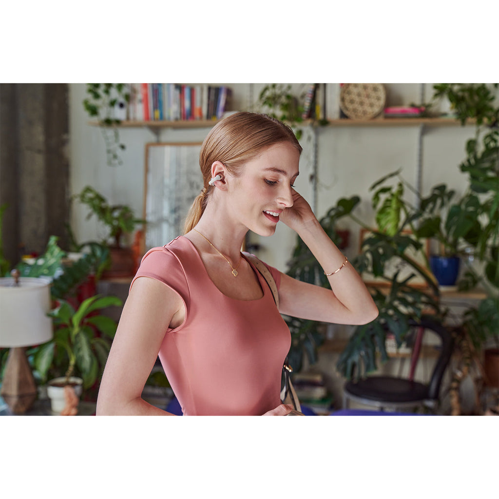 The earbuds rest outside the ear canal, allowing you to stay connected to your environment while enjoying your audio. This is ideal for safety during activities like running or cycling, and for social interactions.