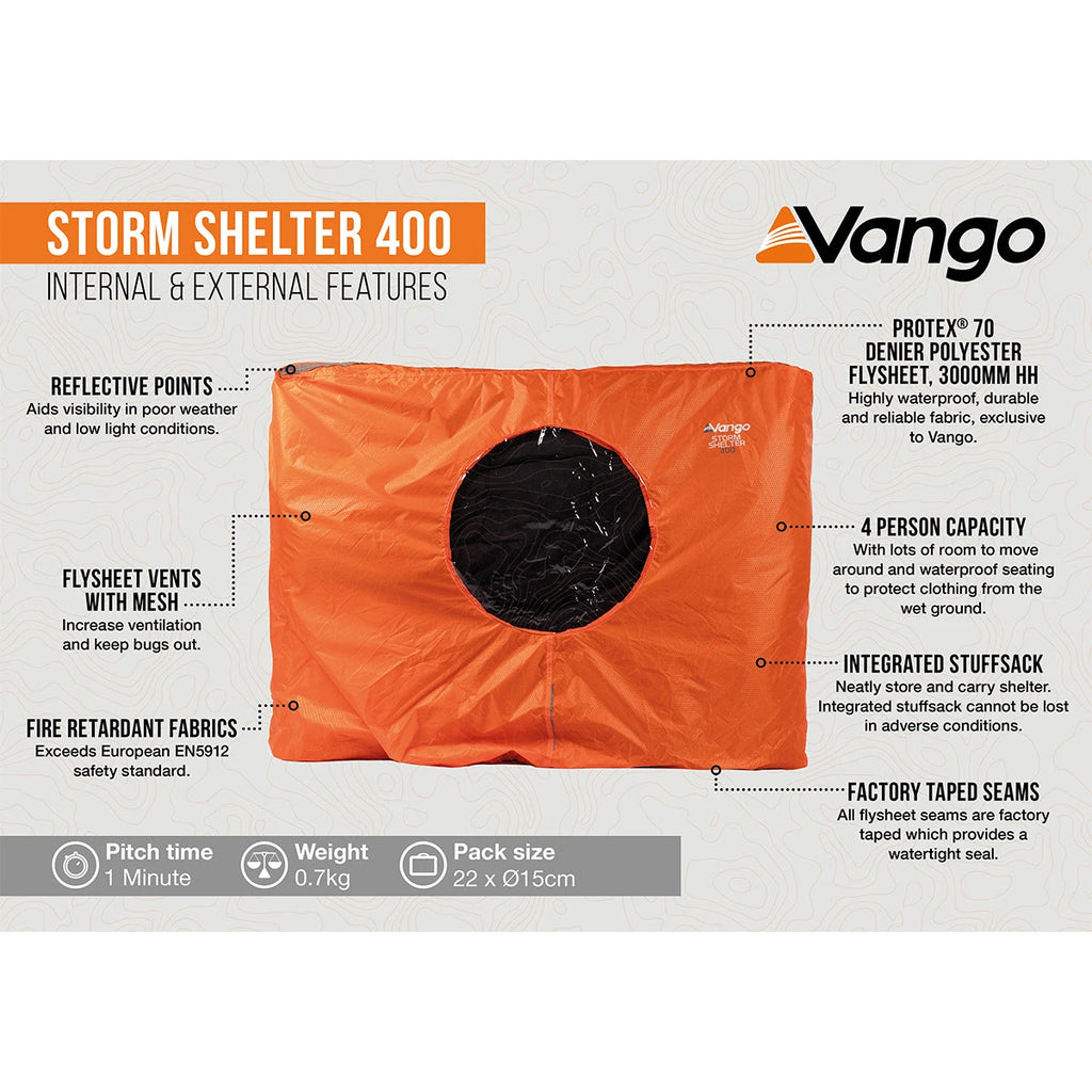 Elevate your camping experience with the Vango Storm Shelter 400, a compact and life-saving piece of gear for mountain treks. Its high visibility orange color and reflective tape ensure safety in extreme conditions.