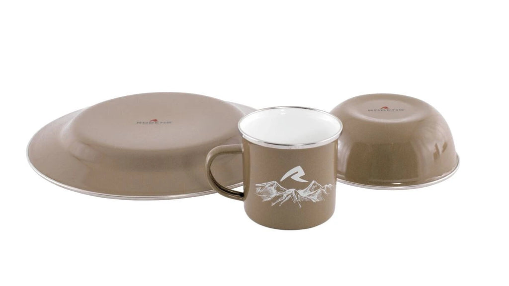Experience outdoor dining with the Robens Tongass Single Enamel Set, featuring durable enamelware for camping adventures.