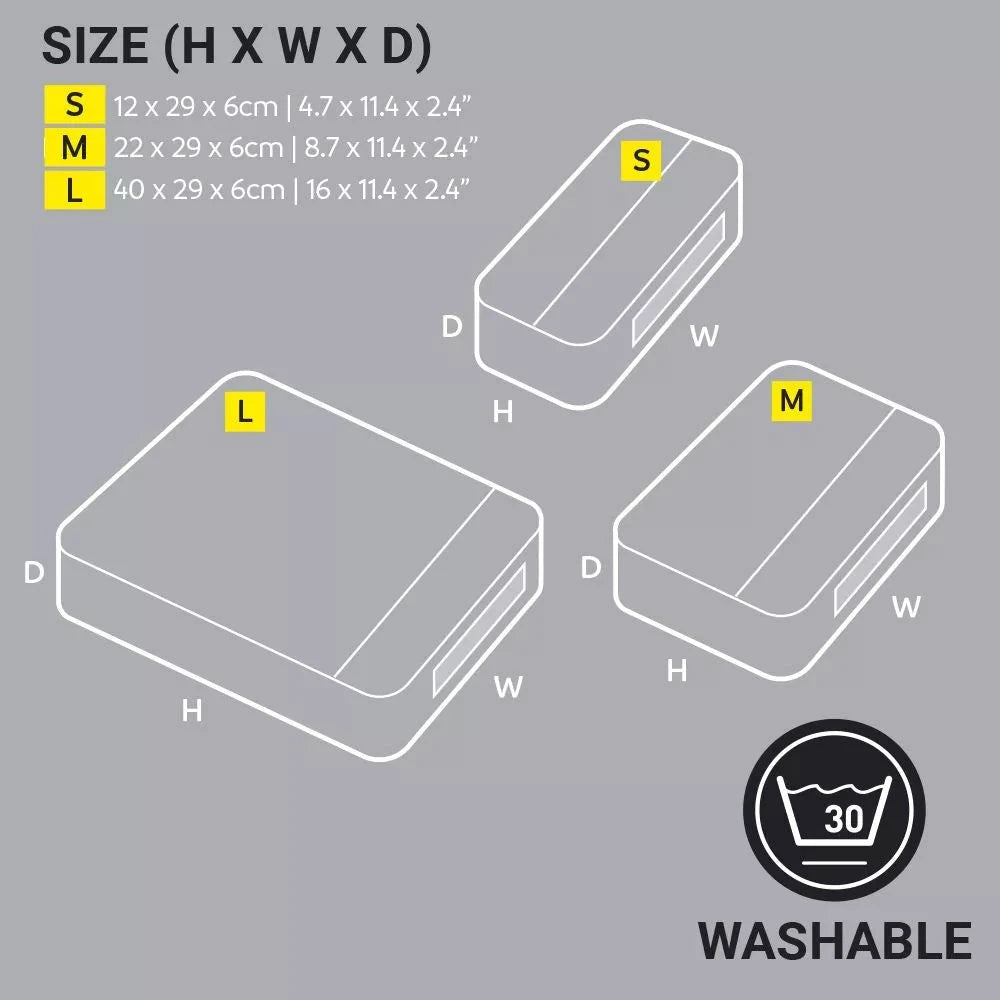 Multi-size, 3-piece packing cube set with perfectly proportioned options for different types of garments from shirts to socks and all your travel essentials. Ideal for effortless, organized packing, they also provide greater garment protection. Quick-grab handles and full-length zips offer immediate access, while the breathable front covers not only make the cubes lightweight but also ensure you can instantly identify what’s inside. Part of the new, coordinated Packing Prepared range, the Cubes are the perfect packing companion for the Twin Packing Cubes, Laundry Bag, and Wet or Dry Bag.