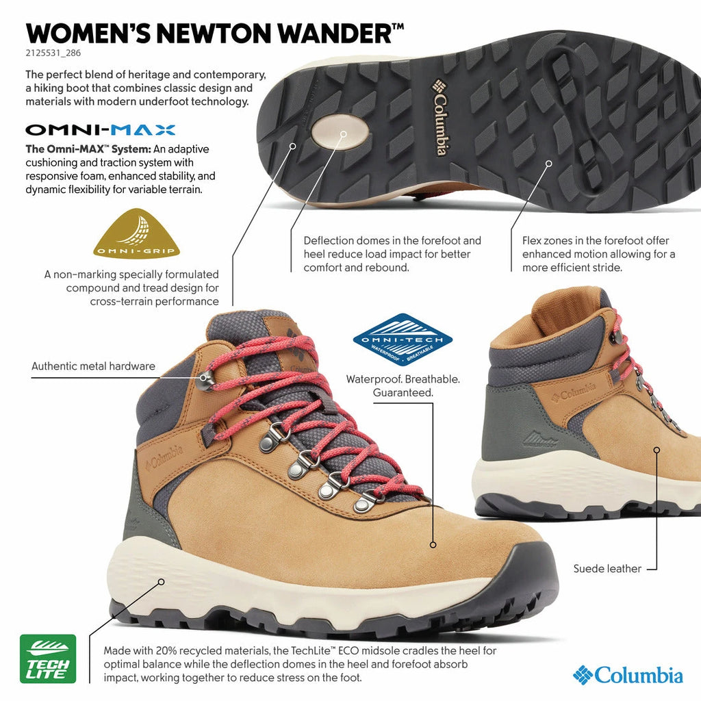 The Columbia Newton Wander™ Boot is a lightweight suede hiking boot designed to combine classic aesthetics with advanced technology for versatile performance. Built with Omni-Tech™ waterproof and breathable materials, it ensures your feet stay dry and comfortable during wet conditions. With Omni-MAX™ adaptive cushioning, TechLite™ midsole for impact absorption, and an Omni-Grip™ outsole for reliable traction, these boots excel on rugged trails and urban streets alike.