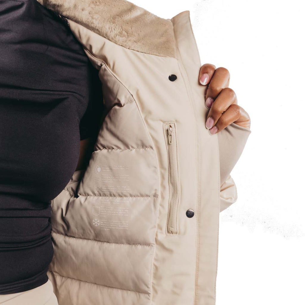 - Detachable and adjustable hood with faux fur trim